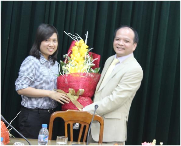 Phó Chủ tịch Công đoàn Viện Đỗ Thị Thu Hằng thay mặt toàn thể chị em phụ nữ Viện nhận hoa chúc mừng nhân ngày 20/10 từ Bí thư Đảng ủy, Q. Viện trưởng Trần Văn Ngợi