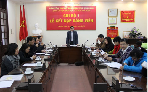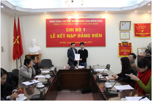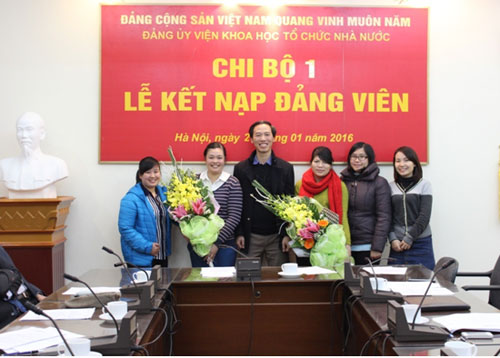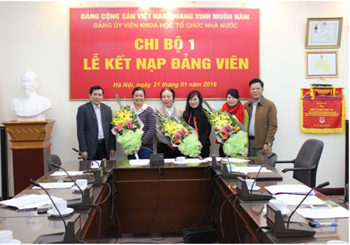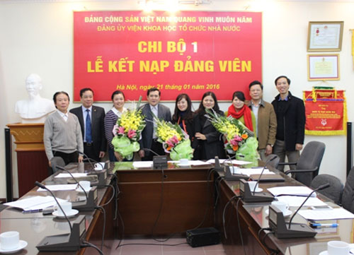 Chiều ngày 21/01/2016, tại Hội trường Viện Khoa học tổ chức nhà nước, Chi bộ 1 thuộc Đảng bộ Viện Khoa học tổ chức nhà nước đã long trọng tổ chức buổi lễ kết nạp Đảng viên cho 03 quần chúng ưu tú là đồng chí Bế Thuận An (Phòng Nghiên cứu quản lý viên chức), đồng chí Phan Thị Vinh (Phòng Nghiên cứu quản lý cán bộ, công chức), đồng chí Nguyễn Thị Quỳnh (Phòng Nghiên cứu tổ chức) và trao Quyết định công nhận Đảng viên chính thức cho đồng chí Trần Trung Kiên (Phòng Nghiên cứu tổ chức).