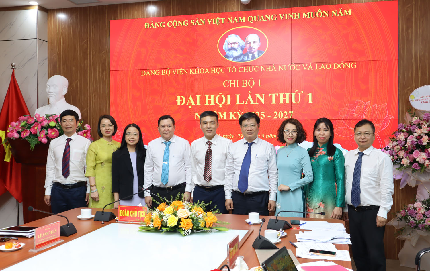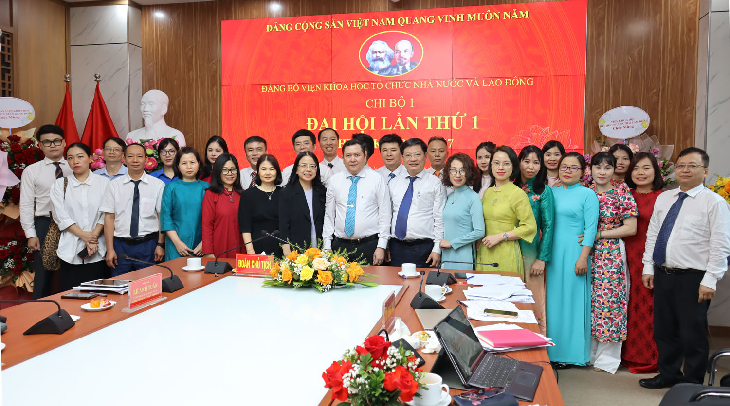 Đồng chí Lê Anh Tuấn, Bí thư Đảng bộ - Viện trưởng Viện KHTCNN&LĐ và các đại biểu tham dự Đại hội chụp ảnh lưu niệm cùng đảng viên Chi bộ 1