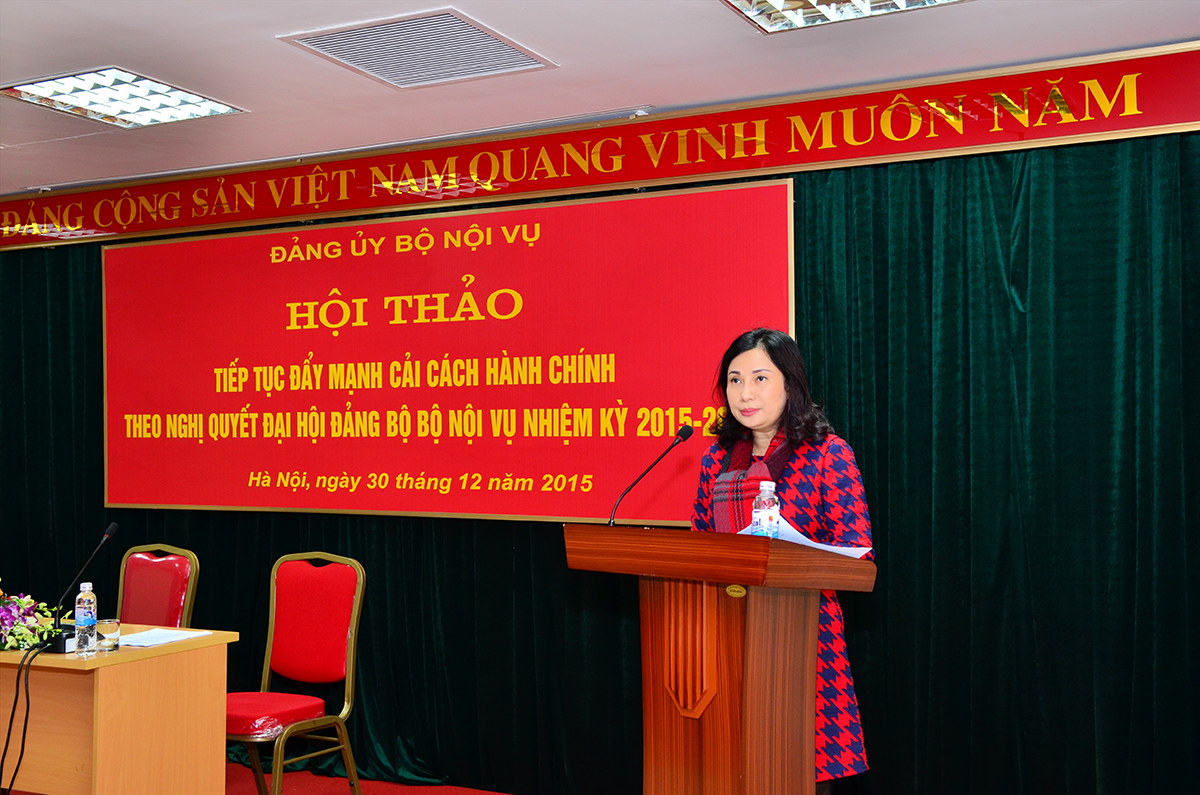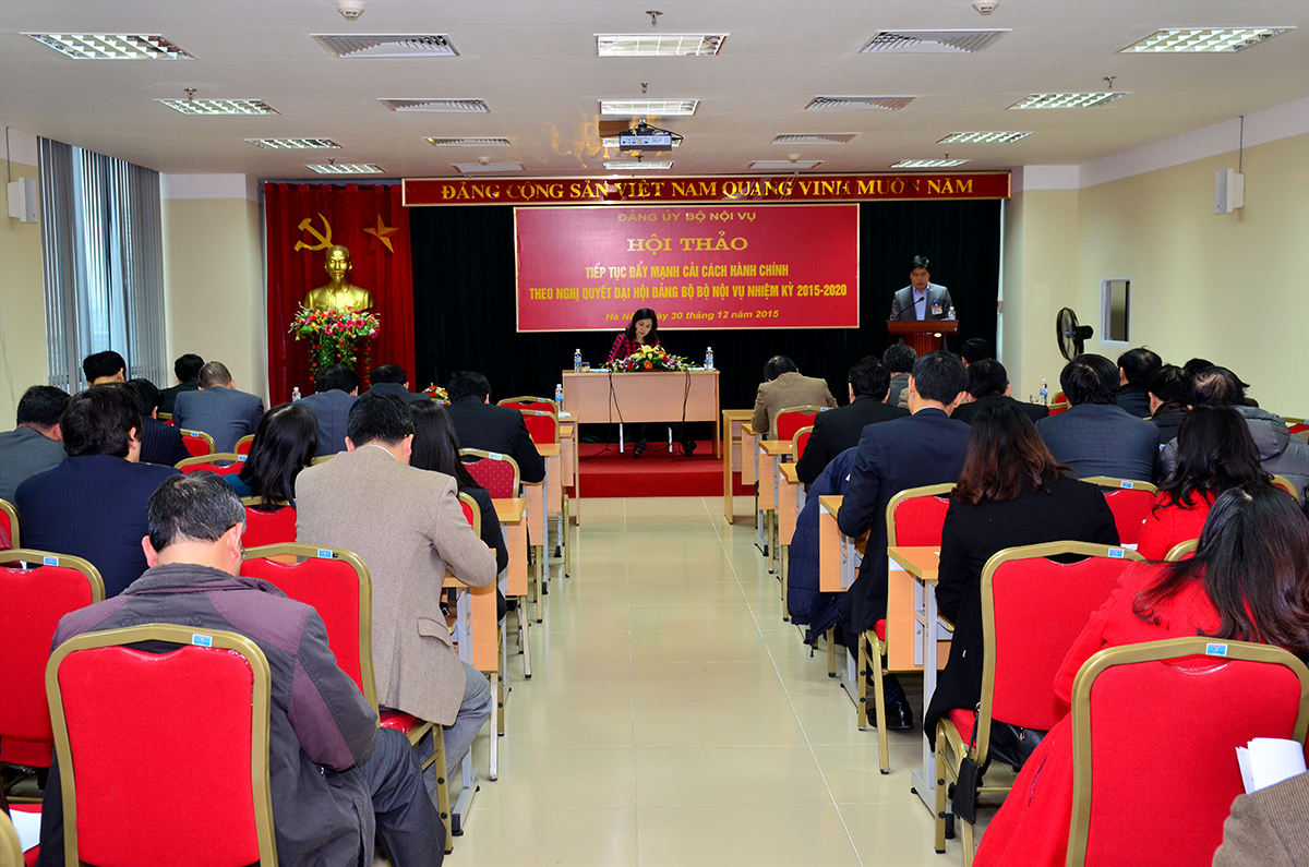 Sáng ngày 30/12/2015, tại Hà Nội, Đảng ủy Bộ Nội vụ đã tổ chức buổi hội thảo xây dựng đề án“Tiếp tục đẩy mạnh cải cách hành chính theo Nghị quyết Đại hội Đảng bộ Bộ Nội vụ nhiệm kỳ 2015 - 2020”. Đồng chí Lê Minh Hương, Ủy viên Ban Thường vụ, Trưởng ban Tuyên giáo Đảng bộ Bộ Nội vụ chủ trì hội thảo.