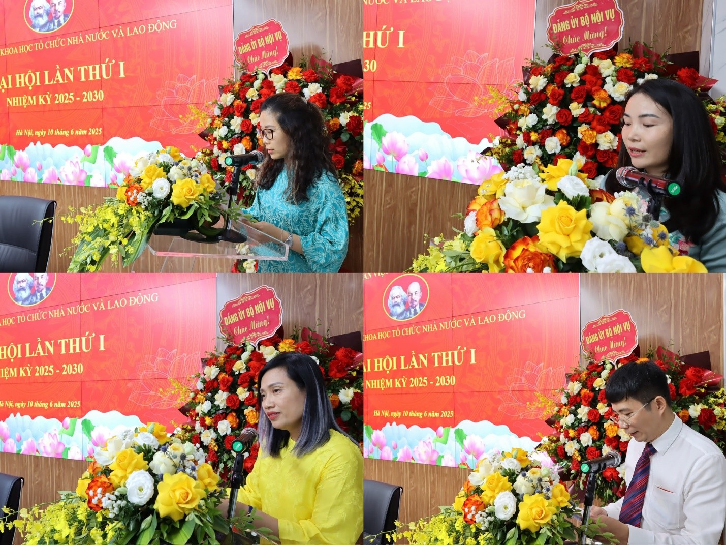 Đại hội đã được nghe tham luận của các đại biểu là đảng viên thuộc Đảng ủy Viện KHTCNN&LĐ về các chủ đề: “Tổ chức chính quyền địa phương 2 cấp – căn cứ pháp lý và thực tiễn.”; “Nâng cao hiệu quả công tác quản lý hoạt động khoa học và công nghệ của Bộ Nội vụ đáp ứng yêu cầu kỷ nguyên số”; “Học tập và làm theo tư tưởng, đạo đức, phong cách Hồ Chí Minh góp phần nâng cao chất lượng công tác chuyên môn của Viện Khoa học Tổ chức Nhà nước và Lao động.”; “Phát huy vai trò hạt nhân chính trị của tổ chức đảng cơ sở, góp phần xây dựng Đảng bộ Viện Khoa học Tổ chức nhà nước và Lao động vững mạnh toàn diện, đáp ứng yêu cầu nhiệm vụ trong giai đoạn mới”;…