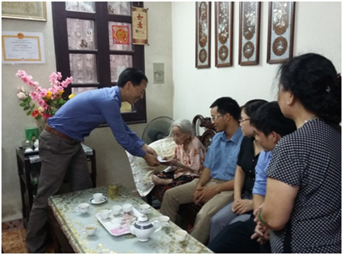 Đồng chí Trần Văn Khánh tặng quà cho ông Hà Quang Thái hiện nay ông không còn được minh mẫn, là bố Liệt sĩ Hà Quang Sơn