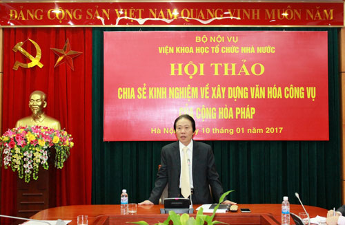 Trong khuôn khổ hợp tác nghiên cứu khoa học giữa Viện Khoa học tổ chức nhà nước, Bộ Nội vụ với Đại sứ quán Cộng hòa Pháp tại Việt Nam và được sự đồng ý của lãnh đạo Bộ Nội vụ, Viện Khoa học tổ chức nhà nước đã phối hợp với Đại sứ quán Cộng hòa Pháp tại Việt Nam tổ chức hội thảo với chủ đề “Chia sẻ kinh nghiệm xây dựng văn hóa công vụ của Cộng hòa Pháp” (Hội thảo) trong hai ngày 10 và 11/01/2017.