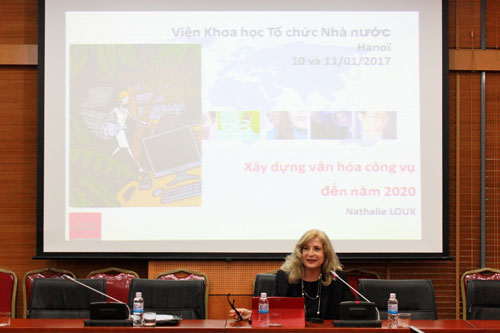 Ngay sau báo cáo tổng quan về văn hóa công vụ tại Việt Nam, các đại biểu tham dự tiếp tục được bà Nathalie Loux chia sẻ về lịch sử xây dựng, hình thành và những kinh nghiệm thực tế về văn hóa công vụ tại Pháp với các năm nội dung lớn: (i) Các mục tiêu, bối cảnh; (ii) Các thành tố văn hóa; (iii) Nghi thức lễ tân, yếu tố nổi của văn hóa; (iv) Các giá trị, chất gắn kết quốc gia; (v) Mô hình một bộ quy tắc ứng xử (lễ nghi). Theo chuyên gia, mọi tổ chức đều có những lý do để tồn tại, các mục tiêu, các hạn chế, tập hợp niềm tin, giá trị và các mô hình ứng xử mà các thành viên của nhóm hay của một tập thể hay tổ chức cùng có. Nguồn gốc của ứng xử tạo nên một cách thức hoạt động đồng thời tạo nên một mức độ cơ bản các quy định và các hệ thống quản lý. Văn hóa tổ chức là một tổng thể phức hợp, không cụ thể và cho phép mỗi cá nhân tự xác định bản thân. Văn hóa trước hết tạo nên đặc điểm của một nhóm xã hội chứ không phải là những cá nhân riêng lẻ và gồm nhiều quy mô như: Một đất nước (văn hóa quốc gia); Một dân tộc (văn hóa bộ tộc); Một tổ chức (văn hóa tổ chức); Một gia đình (văn hóa gia đình); Một tôn giáo (văn hóa tôn giáo); Một thế hệ; Một ngành nghề (văn hóa nghề) ... Văn hóa là một mẫu xuyên qua những bằng chứng cụ thể tập trung vào di sản chung và mang tính chất lâu đời.
