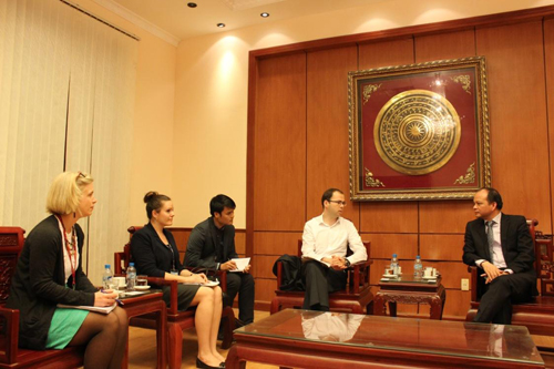 Trưởng đoàn Canađa, ông Vlad Ionescu trao đổi nội dung hợp tác với Quyền Viện trưởng Viện KHTCNN Trần Văn Ngợi