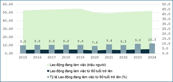 Giai đoạn 2015-2024, số NCT có việc làm tăng từ 4,5 triệu lên 5,3 triệu người, tương ứng tỷ lệ NCT trong tổng số lao động đang làm việc tăng từ 8,5% năm 2015 lên 10,3% năm 2024. Ước tính từ số liệu Điều tra lao động, việc làm năm 2024, trong tổng số 5,3 triệu lao động là NCT có 53,8% là nam và 46,2% là nữ, chủ yếu tập trung ở khu vực nông thôn (khu vực nông thôn chiếm 71,8%, khu vực thành thị chiếm 28,2%).