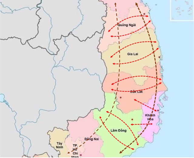 Minh họa về hướng tăng cường liên kết nội tỉnh mới (đông - tây, để "hòa mạng" cùng hai trục bắc - nam sẵn có), đoạn các tỉnh "duyên hải - cao nguyên".