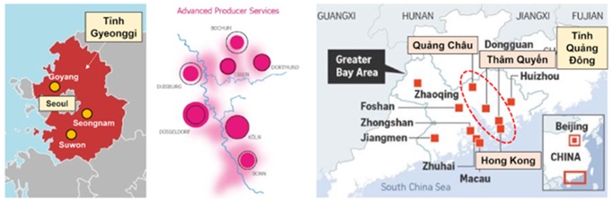 Bản đồ phân vai chức năng nội tỉnh Gyeonggi (Hàn Quốc, trái), nội vùng Rhein-Ruhr (Đức, giữa) và liên tỉnh Quảng Đông - Hong Kong (Trung Quốc, phải). Tổng hợp: Tác giả