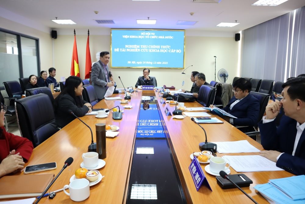 Ngày 26/12/2023, tại trụ sở Bộ Nội vụ, Viện Khoa học tổ chức nhà nước đã tổ chức nghiệm thu chính thức đề tài khoa học cấp Bộ “Phương thức hoạt động của bộ máy hành chính nhà nước Việt Nam - Những vấn đề lý luận và thực tiễn” do TS. Lê Anh Tuấn, Viện trưởng Viện Khoa học tổ chức nhà nước làm chủ nhiệm, Viện Khoa học tổ chức nhà nước là tổ chức chủ trì.