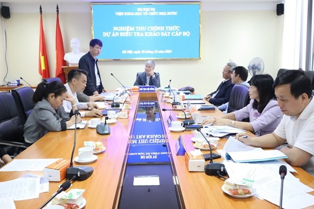 Ngày 10/12/2024, tại trụ sở Bộ Nội vụ, Viện Khoa học tổ chức nhà nước đã tổ chức nghiệm thu chính thức dự án điều tra khảo sát cấp Bộ “Điều tra, đánh giá thực trạng thí điểm đổi mới cách tuyển chọn lãnh đạo, quản lý cấp vụ, cấp sở, cấp phòng” do Viện Khoa học tổ chức nhà nước là đơn vị tổ chức chủ trì.