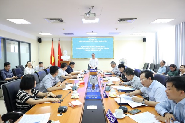 Ngày 29/8/2024, tại trụ sở Bộ Nội vụ, Viện Khoa học tổ chức nhà nước đã tổ chức nghiệm thu chính thức nhiệm vụ “Điều tra đánh giá thực trạng, đề xuất giải pháp hoàn thiện phân cấp, phân quyền giữa Trung ương và địa phương ở Việt Nam” thuộc Chương trình khoa học trọng điểm cấp Bộ: “Tổ chức hoạt động của bộ máy hành chính nhà nước đáp ứng yêu cầu đổi mới quản trị quốc gia theo hướng hiện đại, hiệu quả” do TS. Lê Anh Tuấn, Viện trưởng Viện Khoa học tổ chức nhà nước, Bộ Nội vụ làm chủ nhiệm, Viện Khoa học tổ chức nhà nước là tổ chức chủ trì.