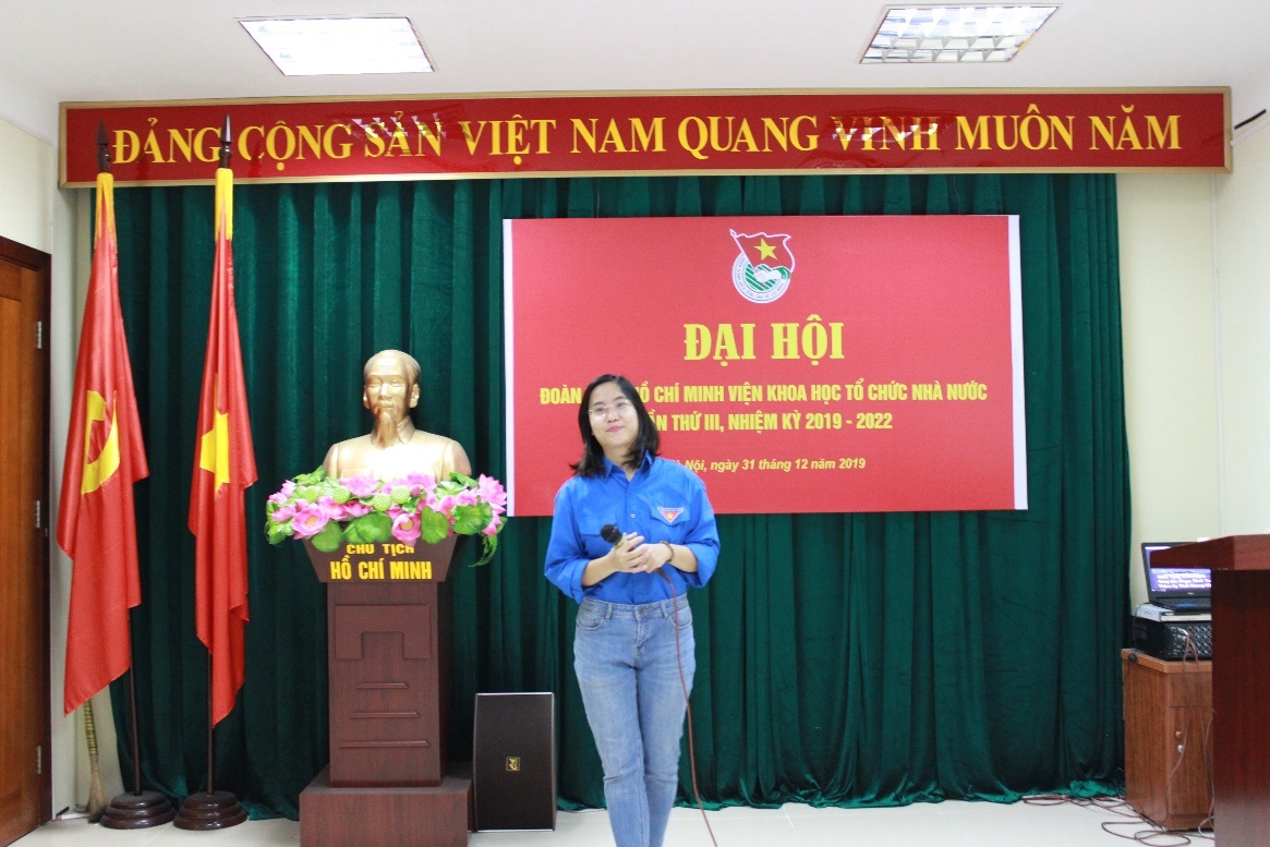 Tại Đại hội, đồng chí Trần Thị Ngọc Khuyên, Phó Bí thư Đoàn thanh niên Viện đã trình bày báo cáo tổng kết công tác đoàn và phong trào thanh niên nhiệm kỳ 2017 - 2019 và phương hướng, nhiệm vụ trọng tâm nhiệm kỳ 2019 -2022 của Đoàn thanh niên Viện Khoa học tổ chức nhà nước. Chủ đề của Đại hội “Tuổi trẻ Viện Khoa học tổ chức đoàn kết, xung kích và sáng tạo”. Trong nhiệm kỳ vừa qua, Đoàn Thanh niên Viện Khoa học tổ chức nhà nước đã chủ động, tích cực đẩy mạnh các hoạt động phong trào đoàn gắn liền với hoàn thành tốt công tác chuyên môn; xây dựng tổ chức đoàn đoàn kết, gắn bó, đoàn viên thanh niên cùng phát huy vai trò xung kích, sáng tạo, quyết tâm hoàn thành tốt các nhiệm vụ công tác đã đề ra. Báo cáo đã tổng kết những kết quả đạt được của Đoàn thanh niên trong nhiệm kỳ lần thứ II, chỉ ra những tồn tại, nguyên nhân, bài học kinh nghiệm và mục tiêu, phương hướng của Đoàn thanh niên trong nhiệm kỳ mới.