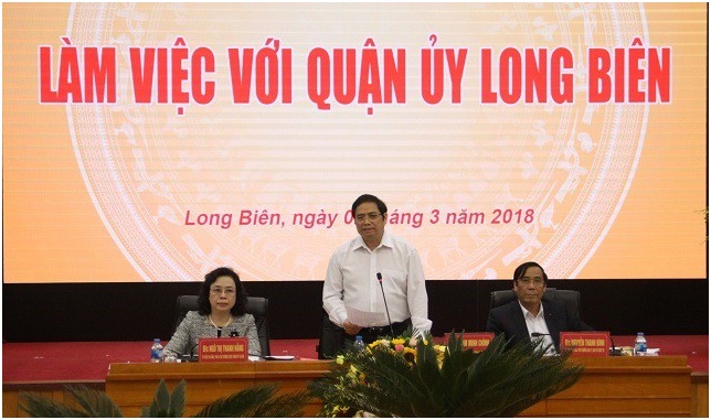 Đồng chí Phạm Minh Chính, Ủy viên Bộ Chính trị, Bí thư Trung ương Đảng, Trưởng Ban Tổ chức Trung ương tại buổi làm việc với quận Long Biên (Hà Nội) về công tác tinh giản biên chế. (Ảnh: HH)