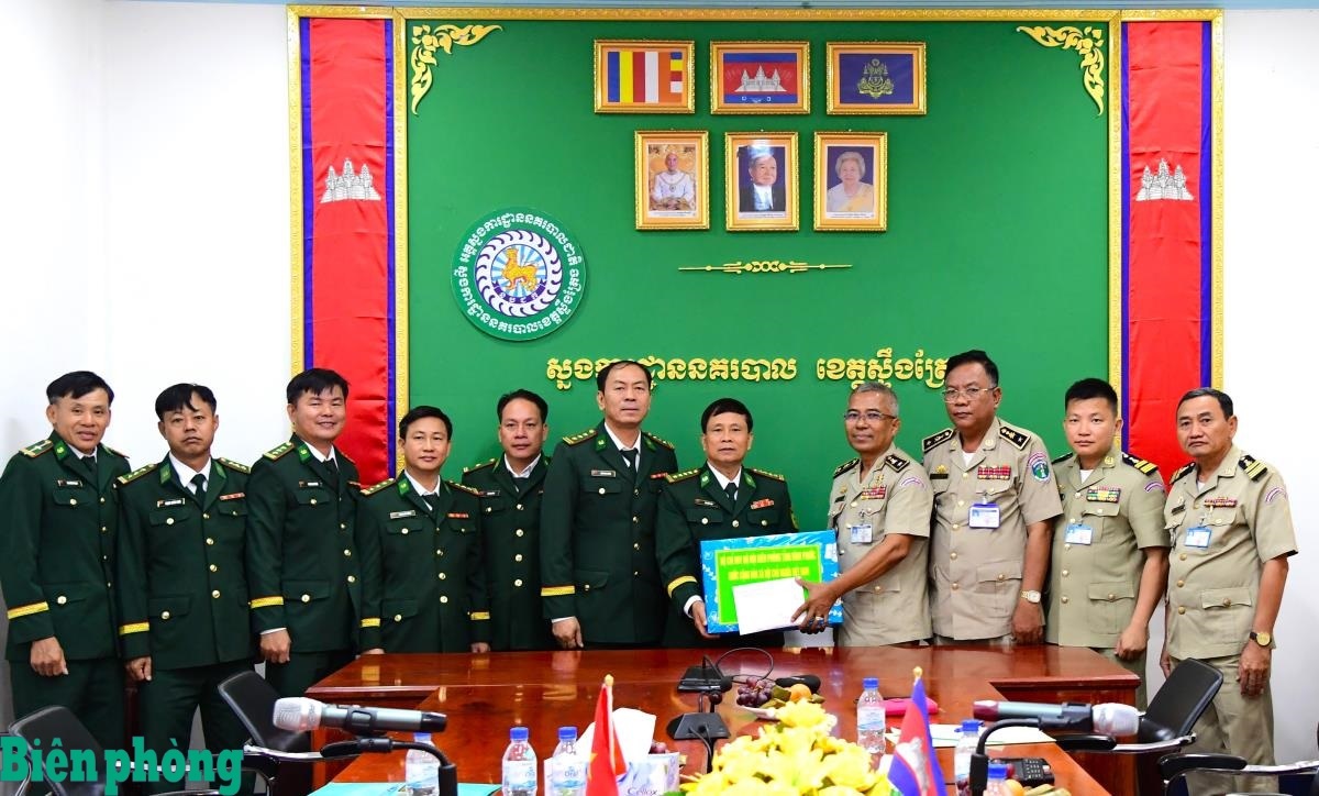 Nhân dịp Tết cổ truyền Chol Chnam Thmay 2025 của dân tộc Campuchia, đoàn công tác của Bộ Chỉ huy BĐBP Bình Phước tặng quà chúc mừng năm mới Ty Công an, Bộ Chỉ huy Hiến binh tỉnh Stung Treng, Campuchia. Ảnh: Hữu Thịnh