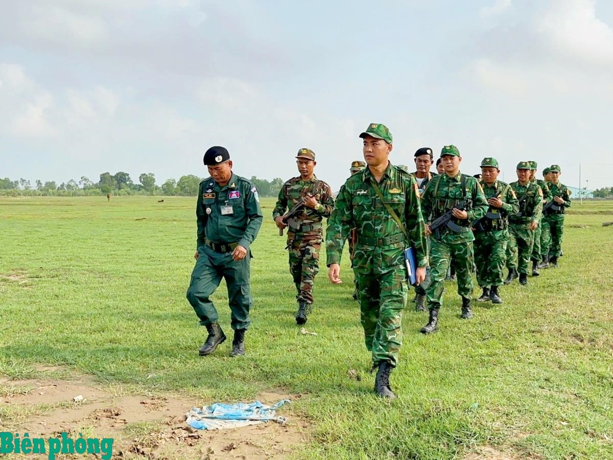 Cán bộ, chiến sĩ Đồn Biên phòng cửa khẩu Mỹ Quý Tây, BĐBP Long An phối hợp với lực lượng quản lý, bảo vệ biên giới Campuchia tuần tra song phương đoạn biên giới được giao phụ trách, quản lý. Ảnh: Minh Luận