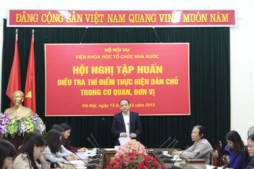 Trong khuôn khổ Dự án “Điều tra thực trạng, đề xuất giải pháp nâng cao hiệu quả thực hiện Quy chế dân chủ cơ sở” ngày 15/12/2015, Viện Khoa học tổ chức nhà nước, Bộ Nội vụ đã tổ chức hội nghị tập huấn “Điều tra thí điểm thực hiện dân chủ trong cơ quan, đơn vị” đối với một số cơ quan hành chính, đơn vị sự nghiệp công lập của Bộ Công thương và Bộ Văn hóa, Thể thao và Du lịch.