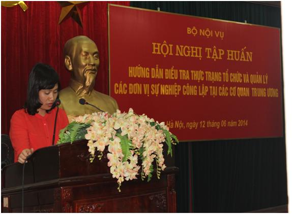 Bà Đỗ Thị Thu Hằng, Phó Trưởng phòng Nghiên cứu tổ chức đã hướng dẫn xây dựng nội dung Báo cáo đánh giá thực trạng tổ chức và quản lý các đơn vị sự nghiệp công lập. Báo cáo gồm 2 mẫu: Mẫu 1 dành cho cơ quan quản lý các đơn vị sự nghiệp công lập; Mẫu 2 dành cho các đơn vị sự nghiệp công lập. Nội dung của 2 mẫu báo cáo tập trung vào các vấn đề sau: Tình hình tổ chức các đơn vị sự nghiệp công lập trực thuộc; Thực trạng quản lý các đơn vị sự nghiệp công lập; Thực hiện cơ chế tự chủ, tự chịu trách nhiệm và cơ chế tài chính của các đơn vị sự nghiệp công lập; Đề xuất, kiến nghị về tổ chức và cơ chế quản lý đơn vị sự nghiệp công lập hiện nay.