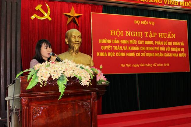 Thay mặt Bộ Khoa học và Công nghệ, đồng chí Nguyễn Thị Thu Hiền, Phó Vụ trưởng Vụ Kế hoạch tổng hợp trân trọng cảm ơn sự quan tâm của Lãnh đạo Bộ Nội vụ đến việc tổ chức Hội nghị tập huấn nhằm phổ biến nội dung của hai thông tư liên tịch này. Bên cạnh đó, đồng chí Nguyễn Thị Thu Hiền đã giới thiệu và hướng dẫn cụ thể các nội dung trong Thông tư liên tịch 27/2015/TTLT-BKHCN-BTC ngày 30/12/2015 về Quy định khoán chi thực hiện nhiệm vụ KH&CN sử dụng ngân sách nhà nước. Về mặt kết cấu, Thông tư liên tịch 27/2015/TTLT-BKHCN-BTC gồm 5 Chương, 20 Điều, Chương 1 là Những quy định chung; Chương 2 là Quyết định phương thức khoán chi; Chương 3 là Quản lý, sử dụng, thanh quyết toán kinh phí thực hiện nhiệm vụ; Chương 4 là Xử lý đối với nhiệm vụ không hoàn thành và công khai thông tin nhiệm vụ; Chương 5 là Tổ chức thực hiện.