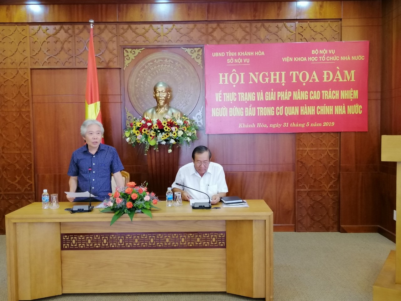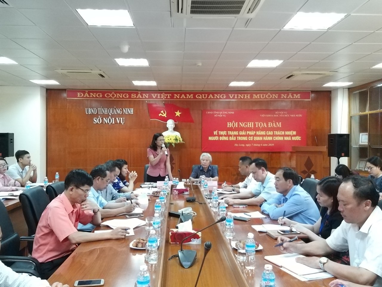 Trong khuôn khổ Dự án “Thực trạng và giải pháp nâng cao trách nhiệm người đứng đầu trong cơ quan hành chính nhà nước”, trong các ngày 31/5/2019 và ngày 07/6/ 2019, Viện Khoa học tổ chức nhà nước – Bộ Nội vụ đã phối hợp với Sở Nội vụ tỉnh Khánh Hòa và Sở Nội vụ tỉnh Quảng Ninh tổ chức Hội nghị tọa đàm điều tra khảo sát.