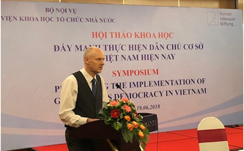 Ông Peter Girke, Trưởng đại diện Viện KAS tại Việt Nam cho biết: Một nền dân chủ ổn định từ cơ sở sẽ cho phép những người được trao quyền điều hành và người bị điều hành thuận lợi khi nhìn nhận một hệ thống giá trị tạo nên niềm tin của cộng đồng, làm cho niềm tin đó được củng cố, hoạt động quản lý của bộ máy công quyền do đó sẽ hiệu quả hơn. Hy vọng hội thảo này sẽ tiếp tục hoàn thiện, nâng cao chất lượng, hiệu quả công tác quy chế dân chủ ở cơ sở tại Việt Nam trong thời gian tới.