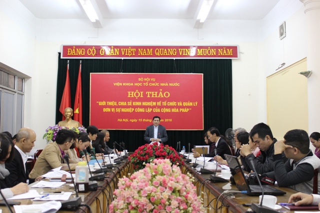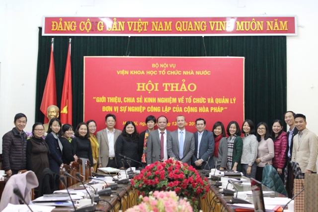 Trong khuôn khổ hợp tác nghiên cứu khoa học giữa Viện Khoa học tổ chức nhà nước, Bộ Nội vụ Việt Nam và Đại sứ quán Cộng hòa Pháp tại Hà Nội, trong hai ngày 15-16/12/2016, Viện Khoa học tổ chức nhà nước đã phối hợp với Đại sứ quán Cộng hòa Pháp tổ chức hội thảo “Giới thiệu, chia sẻ kinh nghiệm về tổ chức và quản lý đơn vị sự nghiệp công lập của cộng hòa Pháp” (Hội thảo).