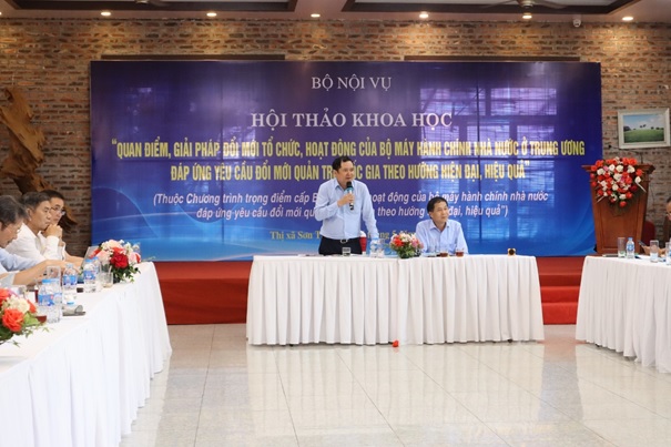 Theo đó, Thứ trưởng nhấn mạnh đổi mới quản trị quốc gia theo hướng hiện đại, hiệu quả đòi hỏi tất yếu phải đổi mới tổ chức, hoạt động của bộ máy Nhà nước nói chung và bộ máy HCNN nói riêng, trong đó có bộ máy chính nhà nước ở Trung ương phù hợp với những đặc trưng, chuẩn mực của quản trị quốc gia hiện đại, hiệu quả. Đổi mới, hoàn thiện bộ máy hành chính nhà nước Trung ương đáp ứng yêu cầu quản trị quốc gia hiện đại, hiệu quả trong điều kiện đặc thù của Việt Nam cần tiếp tục nghiên cứu hoàn thiện. Do đó, Thứ trưởng yêu cầu các chuyên gia, các nhà khoa học cần tập trung nghiên cứu, thảo luận, làm rõ một số vấn đề như như: nhận thức và vận dụng nguyên tắc tập trung dân chủ trong tổ chức và hoạt động của Đảng vào tổ chức và hoạt động của bộ máy hành chính nhà nước; xây dựng Chính phủ kiến tạo phát triển phù hợp với mục tiêu nhiệm vụ phát triển đất nước trong giai đoạn mới; giải pháp để đẩy nhanh việc xây dựng Chính phủ số, đổi mới mô hình tổ chức, hoạt động của các cơ quan trong bộ máy hành chính nhà nước thích ứng, đáp ứng yêu cầu quản trị trên môi trường số; đổi mới quản trị quốc gia theo hướng hiện đại, hiệu quả đòi hỏi: phải nâng cao vai trò, trách nhiệm của Chính phủ, các bộ, cơ quan ngang Bộ trong cung ứng dịch vụ công; đặt ra yêu cầu đổi mới phương thức hoạt động của bộ máy hành chính nhà nước nói chung cũng như bộ máy hành chính ở Trung ương; phân quyền, phân cấp giữa trung ương và địa phương cần được nhìn nhận như một nhu cầu tất yếu trong quản trị nhà nước, và không chỉ thể hiện một chiều giao quyền từ trung ương xuống địa phương, đảm bảo sự tuân thủ mệnh lệnh của cấp trên, chịu sự giám sát, thanh tra kiểm tra của Trung ương đối với địa phương mà quan trọng phải đảm bảo cho địa phương có được sự chủ động, tính dân chủ trong thực hiện thẩm quyền được phân quyền, phân cấp; hoàn thiện chế độ công vụ, công chức …