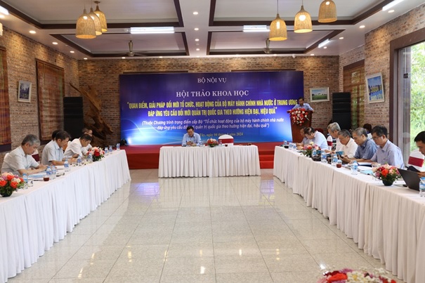 Bên cạnh đó, Hội thảo cũng được nghe các chuyên gia, các nhà khoa học chia sẻ, tham luận một số vấn đề như: Vận dụng nguyên tắc tập trung dân chủ trong sinh hoạt Đảng và tổ chức vận hành bộ máy hành chính nhà nước những vấn đề lý luận và thực tiễn; Mục tiêu, giải pháp đẩy mạnh xây dựng Chính phủ số, chính quyền số ở nước ta hiện nay; Quan điểm, giải pháp nâng cao vai trò, trách nhiệm của Chính phủ trong cung ứng dịch vụ công; Quan điểm, giải pháp đổi mới phương thức hoạt động của bộ máy hành chính nhà nước Việt Nam trong giai đoạn hiện nay; Quan điểm, giải pháp đổi mới phân cấp, phân quyền Trung ương- địa phương; Một số quan điểm, giải pháp đổi mới tổ chức, hoạt động của Bộ, cơ quan ngang Bộ; Quan điểm, giải pháp đổi mới chế độ công vụ, công chức ở Việt Nam hiện nay...