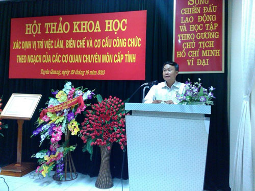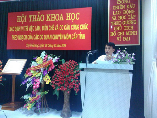 Phát biểu khai mạc hội thảo, đồng chí Trần Nam Phong đã nhấn mạnh tầm quan trọng của việc xác định vị trí việc làm và cơ cấu ngạch công chức trong các cơ quan hành chính nhà nước trên địa bàn tỉnh. Đây là nhiệm vụ trọng tâm nhằm thực hiện nhiệm vụ đổi mới cơ chế quản lý công chức hướng tới một nền công vụ hiệu lực và hiệu quả. Là một tỉnh chăm lo nhiều đến công tác nghiên cứu phát triển ngành Nội vụ, Tuyên Quang đã chủ động xác định công tác xác định vị trí việc làm (VTVL) và cơ cấu ngạch công chức là một nhiệm vụ khoa học phải chủ động nghiên cứu, có như vậy, khi Chính phủ ban hành Nghị định, tỉnh mới đảm bảo thực hiện đạt kết quả chất lượng cao. Hội thảo khoa học “Xác định vị trí việc làm và cơ cấu ngạch công chức của các cơ quan chuyên môn cấp tỉnh” được tổ chức để tổng kết tình hình thực hiện đề tài và tiếp tục hoàn thiện công tác xác định VTVL và cơ cấu ngạch công chức trên địa bàn tỉnh. Sản phẩm chủ yếu của đề tài khoa học này là danh mục vị trí việc làm và bản mô tả công việc của các sở, ban, ngành trên địa bàn tỉnh.