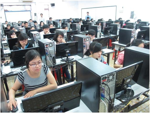Các thí sinh đang làm bài thi trắc nghiệm trên máy tính