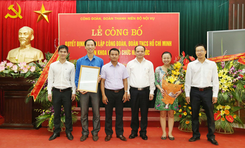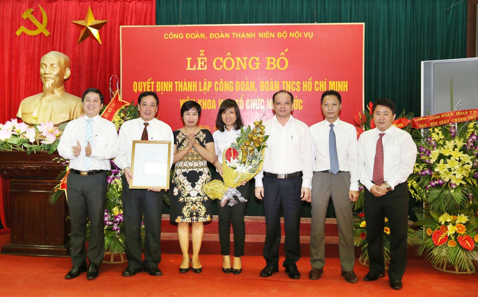Lãnh đạo Công đoàn Bộ Nội vụ và Viện Khoa học Tổ chức nhà nước trao quyết định thành lập và tặng hoa chúc mừng Công đoàn Viện Khoa học tổ chức nhà nước trực thuộc Công đoàn Bộ Nội vụ