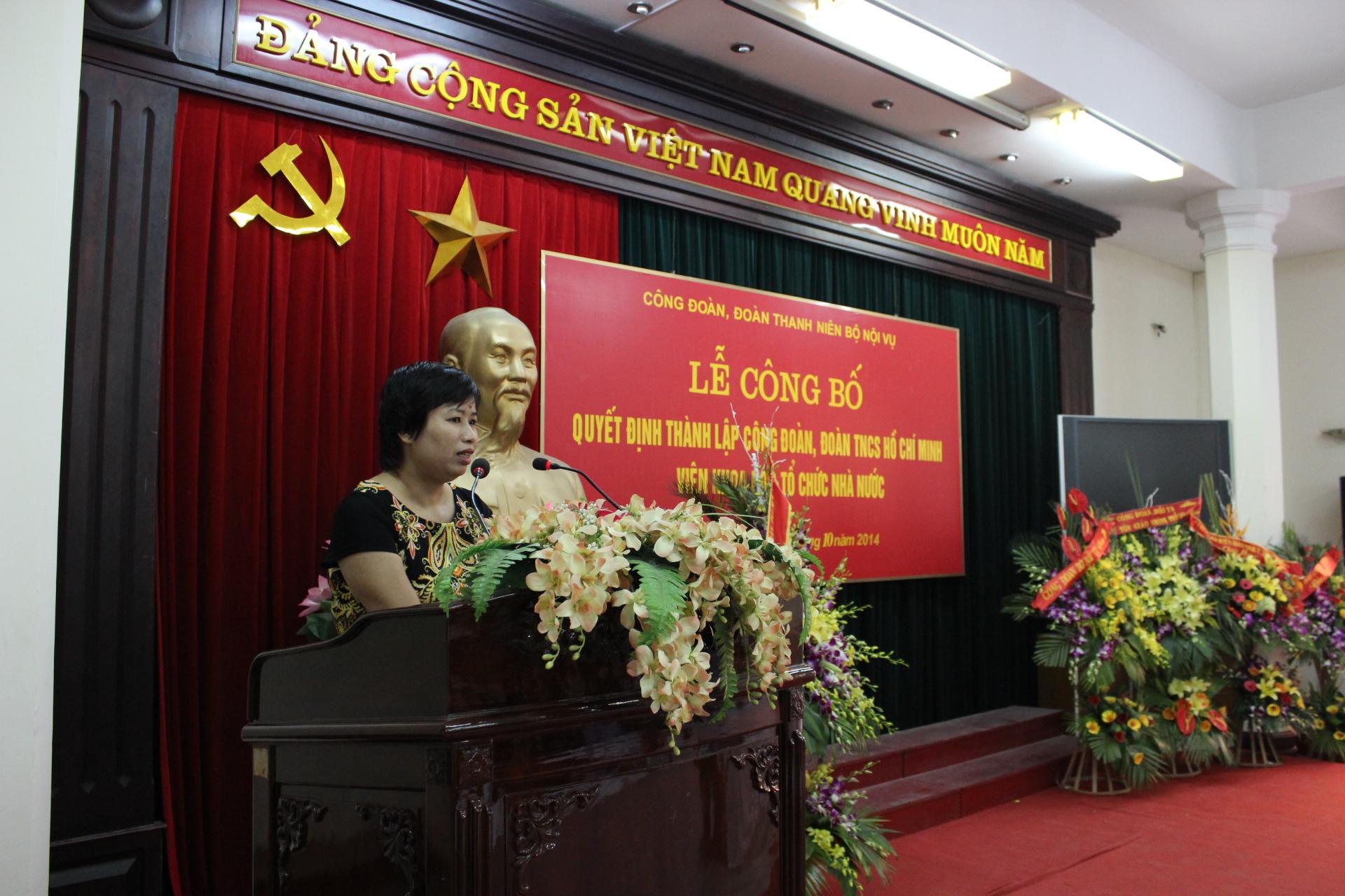 Phát biểu tại buổi Lễ, đồng chí Nguyễn Thị Hà, Phó Chủ tịch Công đoàn Bộ Nội vụ đã hoan nghênh và ghi nhận những đóng góp rất tích cực của Công đoàn Viện cho hoạt động của Công đoàn Bộ Nội vụ trong thời gian qua và mong muốn trong thời gian tới tổ chức Công đoàn Viện sẽ làm tốt các nhiệm vụ với vai trò là Công đoàn cơ sở, là người đại diện cho đoàn viên công đoàn và người lao động.