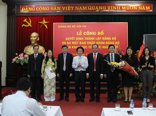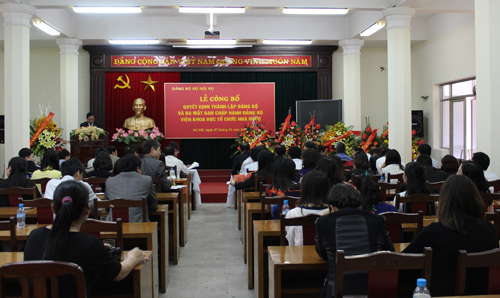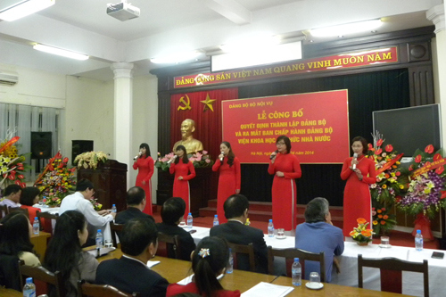 Tiếp theo chương trình của buổi Lễ, thay mặt Đảng bộ Viện KHTCNN vừa được thành lập, đồng chí Vũ Thị Hiền, Phó Bí thư Đảng bộ Viện KHTCNN đã công bố quyết định số 01-QĐ/ĐUKHTCNN ngày 02/4/2014 về việc lập các Chi bộ trực thuộc Đảng bộ Viện KHTCNN. Theo đó, Đảng bộ Viện KHTCNN thành lập 03 Chi bộ trực thuộc: Chi bộ 1 (Phòng Nghiên cứu tổ chức, Phòng Nghiên cứu quản lý cán bộ công chức, Phòng Nghiên cứu quản lý viên chức); có 11 đảng viên do đồng chí Lê Anh Tuấn làm Bí thư; Chi bộ 2 (Trung tâm Thông tin và Thư viện khoa học, Phòng Hành chính - Tổng hợp, Phòng Kế hoạch Tài chính, Dự án Hỗ trợ cải cách chế độ công vụ, công chức); có 12 đảng viên do đồng chí Chu Tuấn Tú làm Bí thư; Chi bộ 3 (Phòng Quản lý khoa học, Trung tâm Nghiên cứu hội, tổ chức phi chính phủ và đào tạo, Phòng Nghiên cứu tiền lương và các chế độ chính sách); có 08 đảng viên do đồng chí Nguyễn Huyền Hạnh làm Bí thư.