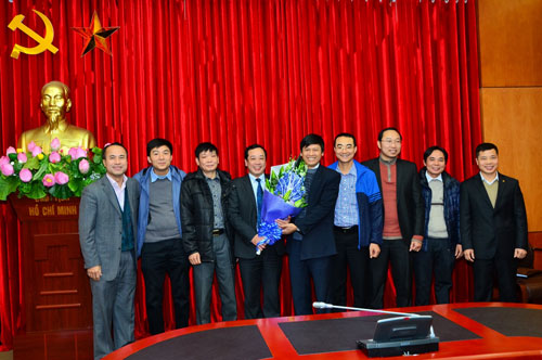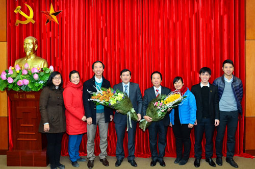 Ông Nguyễn Thanh Bình, Quyền Giám đốc Trung tâm Thông tin và đại diện viên chức Trung tâm Thông tin tặng hoa chúc mừng và chụp ảnh lưu niệm với tân Phó Giám đốc Trung tâm Thông tin Chu Tuấn Tú