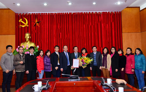 Đại diện công chức, viên chức Viện Khoa học tổ chức nhà nước tặng hoa chúc mừng và chụp ảnh lưu niệm với tân Phó Giám đốc Trung tâm Thông tin Chu Tuấn Tú