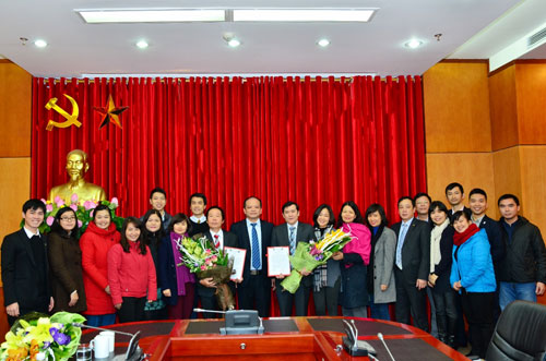 Ông Trần Văn Ngợi, Viện trưởng Viện Khoa học tổ chức nhà nước tặng hoa chúc mừng tân Phó Giám đốc Trung tâm Thông tin Chu Tuấn Tú