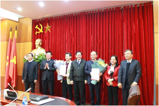 Bộ trưởng Bộ Nội vụ Lê Vĩnh Tân trao Quyết định và tặng hoa chúc mừng cho các đồng chí mới được bổ nhiệm