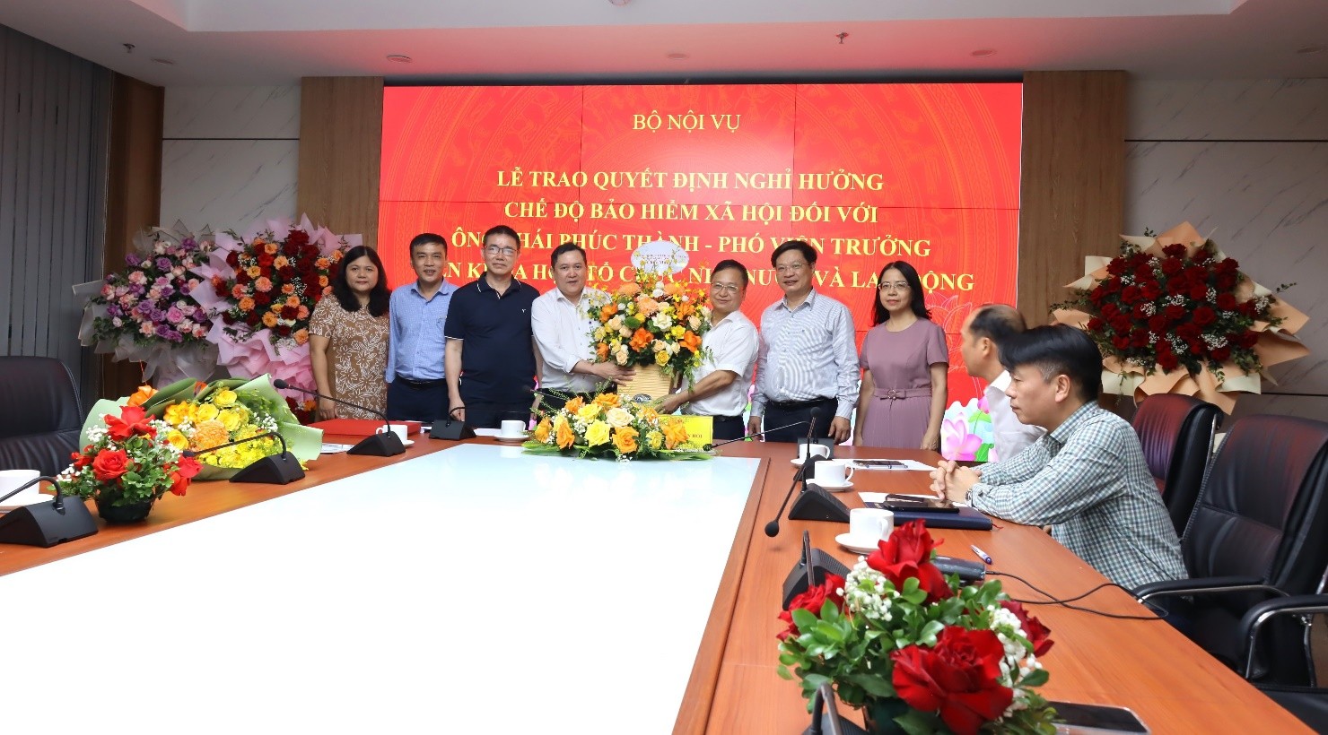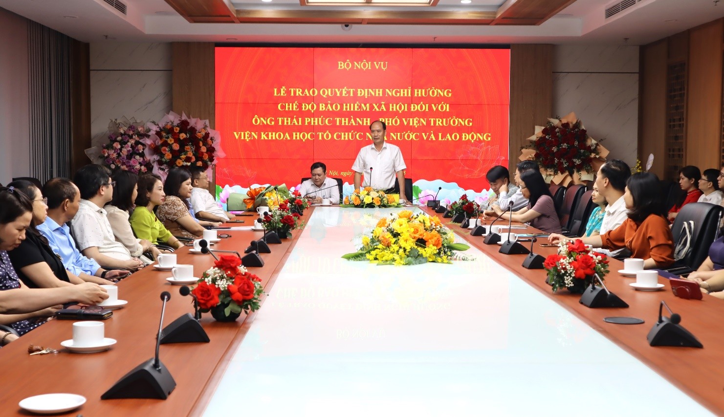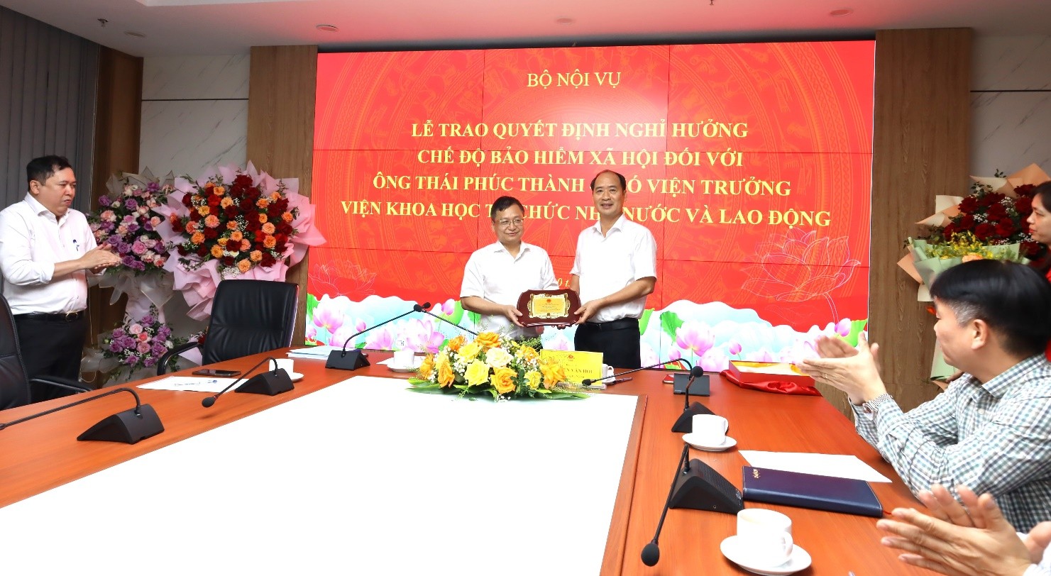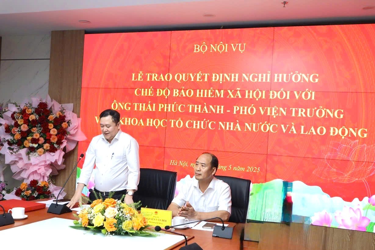 Tại buổi lễ, ông Phạm Hùng Thắng, Phó Vụ trưởng Vụ Tổ chức cán bộ đã công bố Quyết định số 493/QĐ-BNV ngày 16/5/2025 của Bộ trưởng Bộ Nội vụ về việc nghỉ hưu trước tuổi đối với ông Thái Phúc Thành, Phó Viện trưởng Viện Khoa học Tổ chức nhà nước và Lao động, Bộ Nội vụ, kể từ ngày 01/6/2025.