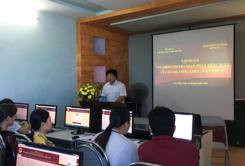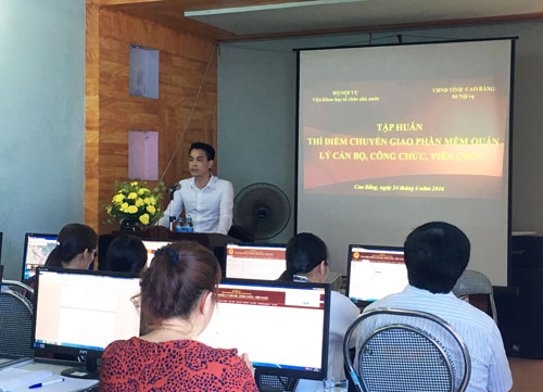 Trong khuôn khổ của kế hoạch triển khai Dự án xây dựng Cơ sở dữ liệu quốc gia cán bộ, công chức, viên chức và cán bộ, công chức cấp xã (CSDL CBCCVC), từ ngày 23/6 đến ngày 24/6/2016, Đoàn Công tác của Viện Khoa học tổ chức nhà nước (Viện KHTCNN) đã tiến hành phối hợp với Sở Nội vụ tỉnh Cao Bằng tổ chức các lớp tập huấn thí điểm chuyển giao phần mềm quản lý cán bộ, công chức, viên chức. Thành phần tham dự của các tỉnh là lãnh đạo, chuyên viên phòng tổ chức cán bộ các sở, ban, ngành tỉnh và lãnh đạo, chuyên viên phòng Nội vụ các huyện, thị xã, thành phố tỉnh Cao Bằng.