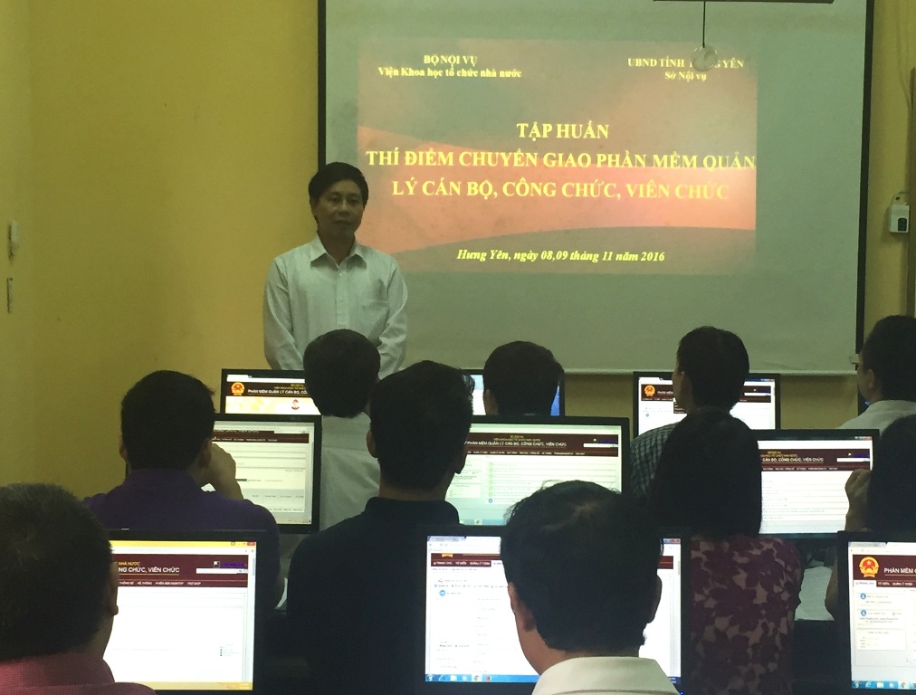 Từ ngày 07/11/2016 đến ngày 09/11/2016, Đoàn Công tác của Viện Khoa học tổ chức nhà nước (Viện KHTCNN) do bà Nguyễn Thu Hà - Phó Giám đốc Trung tâm Thông tin và Thư viện khoa học là Trưởng đoàn đã tiến hành phối hợp với Sở Nội vụ tỉnh Hưng Yên tiến hành chuyển giao phần mềm và tổ chức các lớp tập huấn sử dụng phần mềm quản lý quản lý cán bộ, công chức, viên chức (QLCBCCVC). Thành phần tham dự lớp tập huấn là lãnh đạo, chuyên viên phòng tổ chức cán bộ các sở, ban, ngành của tỉnh và lãnh đạo, chuyên viên Phòng Nội vụ, Phòng Giáo dục và Đào tạo các huyện, thị xã, thành phố của tỉnh Hưng Yên.