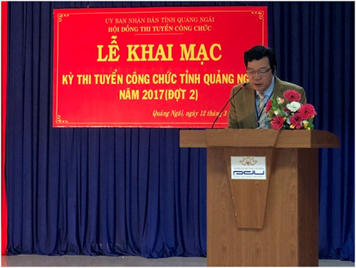 Phát biểu khai mạc kỳ thi ông Đoàn Dụng - Giám đốc Sở Nội vụ, Phó Chủ tịch Hội đồng thi tuyển công chức tỉnh Quảng Ngãi năm 2017 cho biết: Kỳ thi tuyển dụng công chức năm 2017 (đợt 2) nhằm tuyển chọn đội ngũ công chức có chất lượng vào làm việc trong cơ quan, đơn vị của tỉnh Quảng Ngãi là việc làm hết sức quan trọng, nhằm thực hiện thắng lợi nhiệm vụ chính trị và chuyên môn, bổ sung nguồn nhân lực trẻ, có chất lượng cho đội ngũ công chức, viên chức của tỉnh Quảng Ngãi. Để kỳ thi diễn ra thành công, đúng theo quy định pháp luật, ông Đoàn Dụng yêu cầu thành viên Hội đồng tuyển dụng công chức, Ban Coi thi, Ban Giám sát và các bộ phận phục vụ kỳ thi phải thực hiện nhiệm vụ một cách công khai, minh bạch, khách quan, đảm bảo tính cạnh tranh và tuân thủ pháp luật nhằm tạo ra cơ hội bình đẳng cho các thí sinh tham dự kỳ thi tuyển công chức. Đồng thời, ông Đoàn Dụng cũng động viên các thi sinh tham dự kỳ thi hết sức bình tĩnh, tự tin và sáng suốt khi làm bài thi nhằm đạt được kết quả cao nhất.