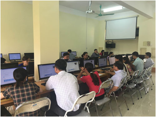 Các thí sinh đang làm bài thi môn trắc nghiệm chuyên ngành trên máy tính