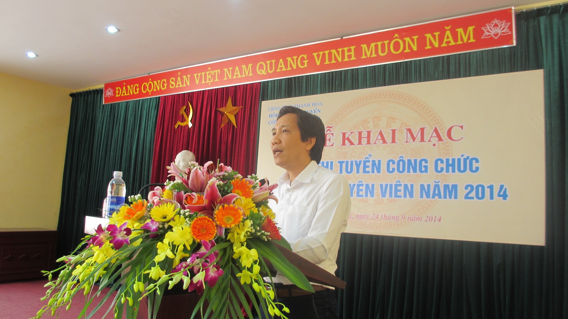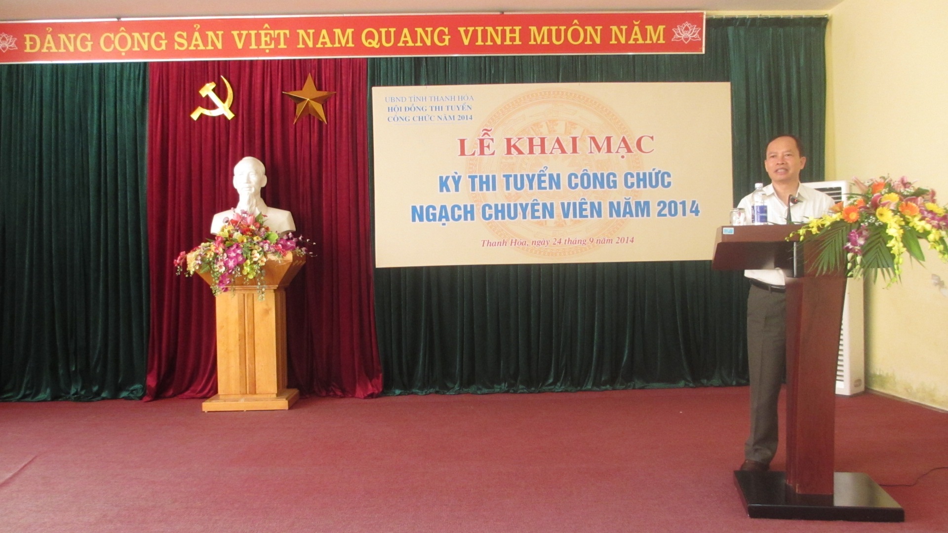 Tại Lễ khai mạc, Chủ tịch UBND tỉnh Thanh Hóa Trịnh Văn Chiến cho biết: Ngay từ năm 2013, HĐND và UBND tỉnh đã quan tâm, chỉ đạo thực hiện rất chặt chẽ việc tuyển dụng công chức đảm bảo nghiêm túc, công khai, minh bạch. Năm 2014, tỉnh quyết tâm làm tốt hơn nữa để tuyển chọn vào bộ máy những người có đủ tiêu chuẩn, có năng lực, trình độ, phẩm chất đạo đức tốt để nhân dân yên tâm, tin tưởng, giữ vững uy tín của cơ quan nhà nước, đáp ứng yêu cầu phát triển kinh tế, xã hội của tỉnh. Kỳ thi tuyển công chức ngạch chuyên viên năm 2014 của UBND tỉnh Thanh Hóa có 2.363 thí sinh tham gia thi tuyển vào 256 chỉ tiêu công chức làm việc trong các cơ quan hành chính nhà nước của tỉnh. Kỳ thi được tổ chức gồm 2 vòng, Vòng 1 từ ngày 25/9 đến ngày 28/9/2014, Hội đồng thi tuyển công chức tỉnh Thanh Hóa sẽ phối hợp với Tổ công tác của Bộ Nội vụ triển khai áp dụng phần mềm tin học thi trắc nghiệm trên máy tính môn Ngoại ngữ và Tin học. Những thí sinh vượt qua vòng 1 sẽ tiếp tục tham gia thi vòng 2, môn Kiến thức chung và môn Nghiệp vụ chuyên ngành từ ngày 10/10 đến ngày 11/10/2014. Chủ tịch UBND tỉnh Thanh Hóa khẳng định, kỳ thi tuyển công chức năm 2014 của tỉnh sẽ được tổ chức đúng quy định của pháp luật, tạo điều kiện cho tất các đối tượng theo quy định có thể tham gia thi một cách công khai, minh bạch, khách quan, công bằng và chính xác./.